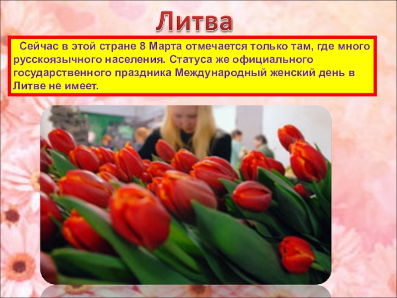 много русскоязычного населения. Статуса же официального государственного праздника Международный женский день в Литве не имеет.