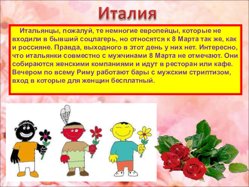 бывший соцлагерь, но относятся к 8 Марта так же, как и россияне. Правда, выходного в этот день у них нет. Интересно, что итальянки совместно с мужчинами 8 Марта не отмечают. Они собираются женскими компаниями и идут в ресторан или кафе. Вечером по всему Риму работают бары с мужским стриптизом, вход в которые для женщин бесплатный.