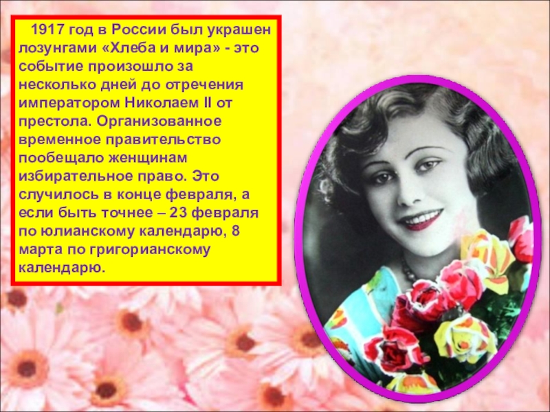 мира» - это событие произошло за несколько дней до отречения императором Николаем II от престола. Организованное временное правительство пообещало женщинам избирательное право. Это случилось в конце февраля, а если быть точнее – 23 февраля по юлианскому календарю, 8 марта по григорианскому календарю.
