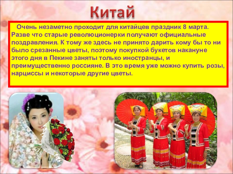 что старые революционерки получают официальные поздравления. К тому же здесь не принято дарить кому бы то ни было срезанные цветы, поэтому покупкой букетов накануне этого дня в Пекине заняты только иностранцы, и преимущественно россияне. В это время уже можно купить розы, нарциссы и некоторые другие цветы.