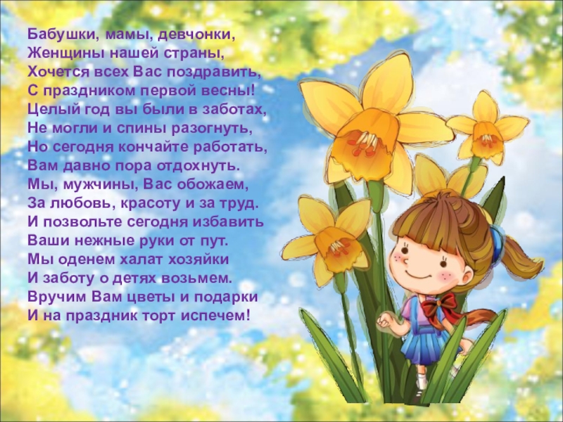 Слайд 22 Традиционно женщин и девушек поздравляют 8 Марта. Дарят цветы,