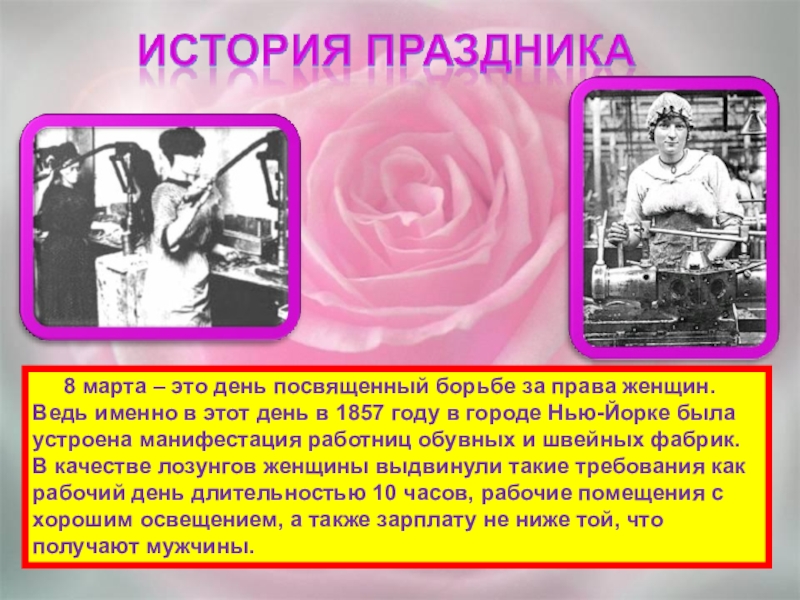 права женщин. Ведь именно в этот день в 1857 году в городе Нью-Йорке была устроена манифестация работниц обувных и швейных фабрик. В качестве лозунгов женщины выдвинули такие требования как рабочий день длительностью 10 часов, рабочие помещения с хорошим освещением, а также зарплату не ниже той, что получают мужчины.