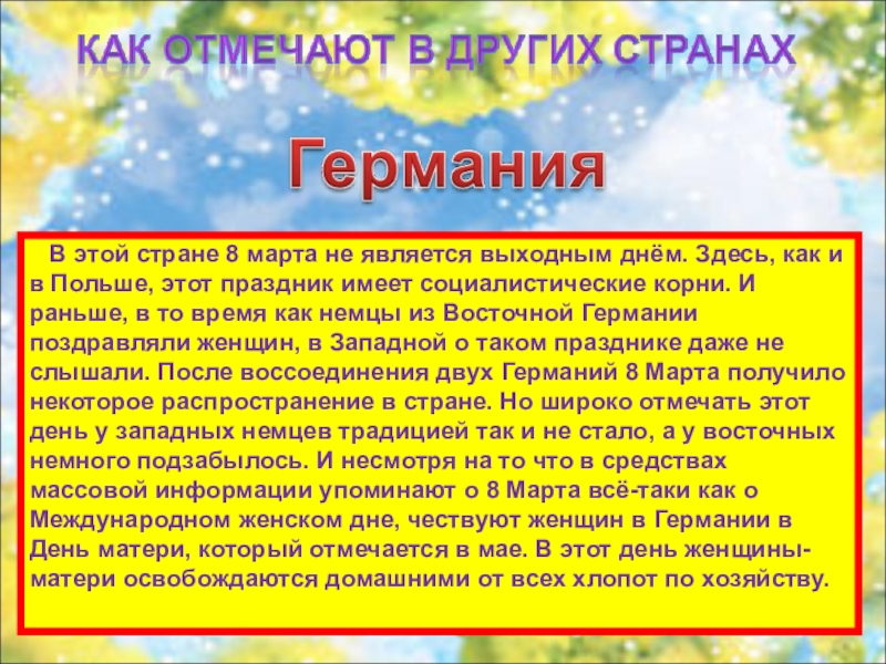 традицию поздравлять женщин 8 марта, но, как и в Германии, этот день у них рабочий.