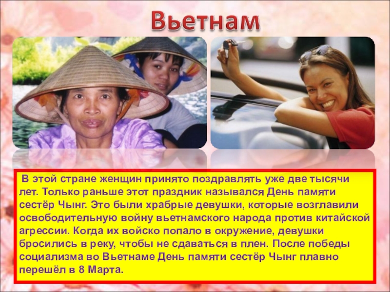 Только раньше этот праздник назывался День памяти сестёр Чынг. Это были храбрые девушки, которые возглавили освободительную войну вьетнамского народа против китайской агрессии. Когда их войско попало в окружение, девушки бросились в реку, чтобы не сдаваться в плен. После победы социализма во Вьетнаме День памяти сестёр Чынг плавно перешёл в 8 Марта.