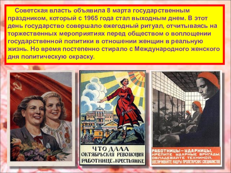 Слайд 8 Советская власть объявила 8 марта государственным праздником, который с