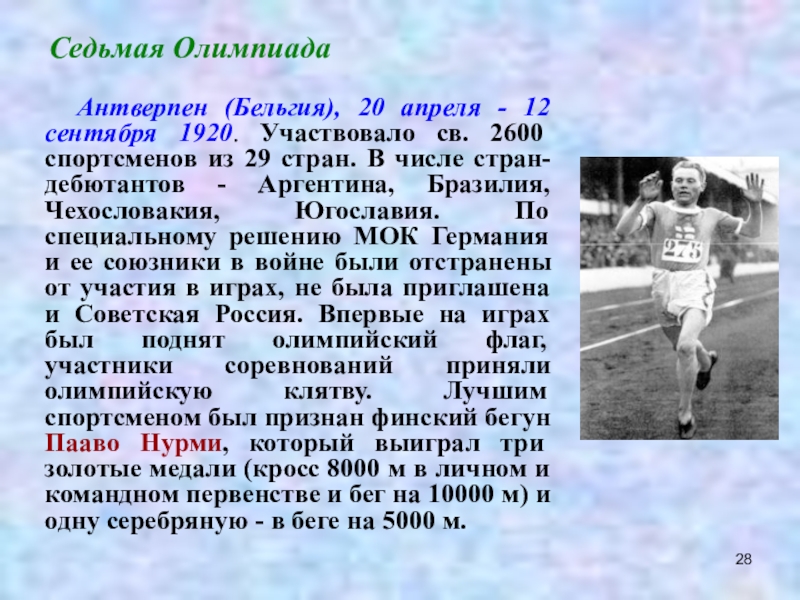 св. 2600 спортсменов из 29 стран. В числе стран-дебютантов - Аргентина, Бразилия, Чехословакия, Югославия. По специальному решению МОК Германия и ее союзники в войне были отстранены от участия в играх, не была приглашена и Советская Россия. Впервые на играх был поднят олимпийский флаг, участники соревнований приняли олимпийскую клятву. Лучшим спортсменом был признан финский бегун Пааво Нурми, который выиграл три золотые медали (кросс 8000 м в личном и командном первенстве и бег на 10000 м) и одну серебряную - в беге на 5000 м.