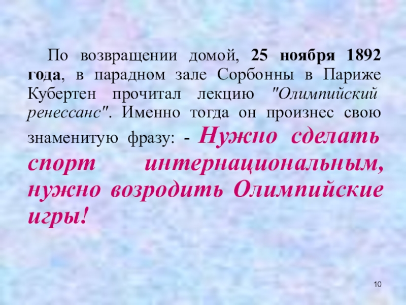 в Париже Кубертен прочитал лекцию "Олимпийский ренессанс". Именно тогда он произнес свою знаменитую фразу: - Нужно сделать спорт интернациональным, нужно возродить Олимпийские игры!