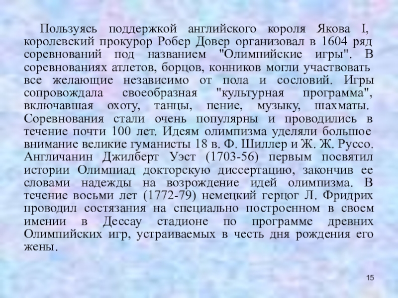 в 1604 ряд соревнований под названием "Олимпийские игры". В соревнованиях атлетов, борцов, конников могли участвовать все желающие независимо от пола и сословий. Игры сопровождала своеобразная "культурная программа", включавшая охоту, танцы, пение, музыку, шахматы. Соревнования стали очень популярны и проводились в течение почти 100 лет. Идеям олимпизма уделяли большое внимание великие гуманисты 18 в. Ф. Шиллер и Ж. Ж. Руссо. Англичанин Джилберт Уэст (1703-56) первым посвятил истории Олимпиад докторскую диссертацию, закончив ее словами надежды на возрождение идей олимпизма. В течение восьми лет (1772-79) немецкий герцог Л. Фридрих проводил состязания на специально построенном в своем имении в Дессау стадионе по программе древних Олимпийских игр, устраиваемых в честь дня рождения его жены.