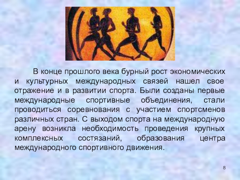 нашел свое отражение и в развитии спорта. Были созданы первые международные спортивные объединения, стали проводиться соревнования с участием спортсменов различных стран. С выходом спорта на международную арену возникла необходимость проведения крупных комплексных состязаний, образования центра международного спортивного движения.