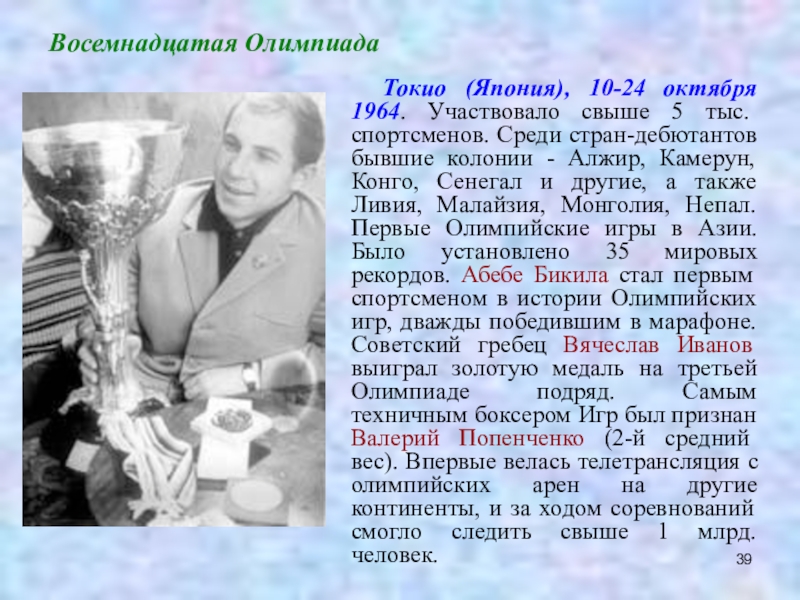 Мехико (Мексика), 12-27 октября 1968. Участвовало свыше 5,5 тыс. спортсменов