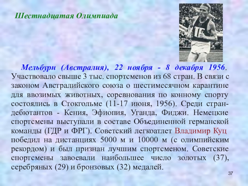 3 тыс. спортсменов из 68 стран. В связи с законом Австралийского союза о шестимесячном карантине для ввозимых животных, соревнования по конному спорту состоялись в Стокгольме (11-17 июня, 1956). Среди стран-дебютантов - Кения, Эфиопия, Уганда, Фиджи. Немецкие спортсмены выступали в составе Объединенной германской команды (ГДР и ФРГ). Советский легкоатлет Владимир Куц победил на дистанциях 5000 м и 10000 м (с олимпийским рекордом) и был признан лучшим спортсменом. Советские спортсмены завоевали наибольшее число золотых (37), серебряных (29) и бронзовых (32) медалей.