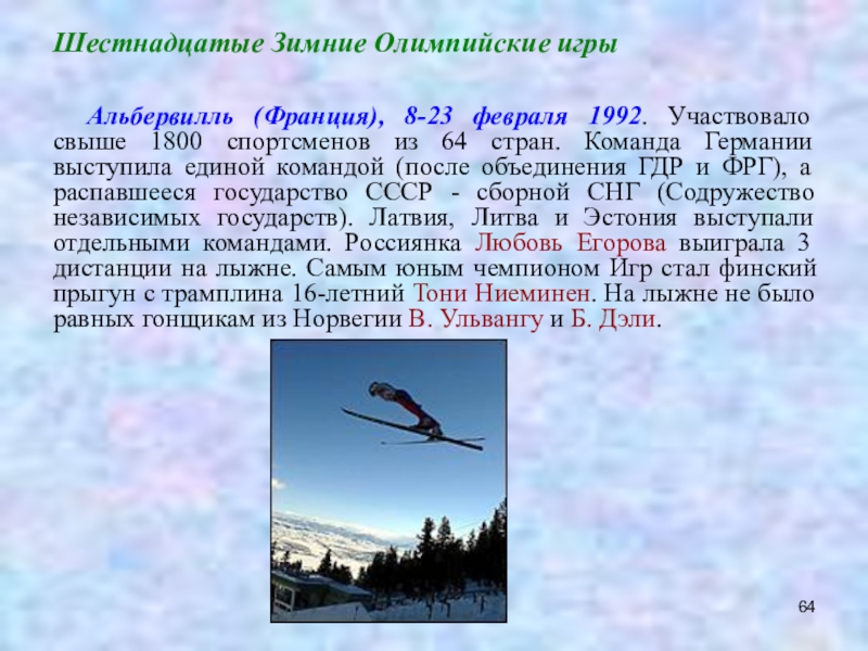 спортсменов из 64 стран. Команда Германии выступила единой командой (после объединения ГДР и ФРГ), а распавшееся государство СССР - сборной СНГ (Содружество независимых государств). Латвия, Литва и Эстония выступали отдельными командами. Россиянка Любовь Егорова выиграла 3 дистанции на лыжне. Самым юным чемпионом Игр стал финский прыгун с трамплина 16-летний Тони Ниеминен. На лыжне не было равных гонщикам из Норвегии В. Ульвангу и Б. Дэли.