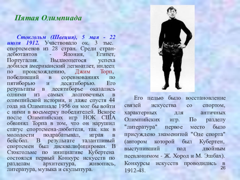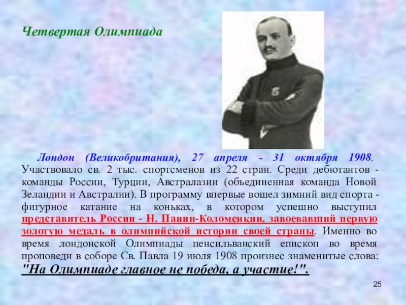 2 тыс. спортсменов из 22 стран. Среди дебютантов - команды России, Турции, Австралазии (объединенная команда Новой Зеландии и Австралии). В программу впервые вошел зимний вид спорта - фигурное катание на коньках, в котором успешно выступил представитель России - Н. Панин-Коломенкин, завоевавший первую золотую медаль в олимпийской истории своей страны. Именно во время лондонской Олимпиады пенсильванский епископ во время проповеди в соборе Св. Павла 19 июля 1908 произнес знаменитые слова: "На Олимпиаде главное не победа, а участие!".
