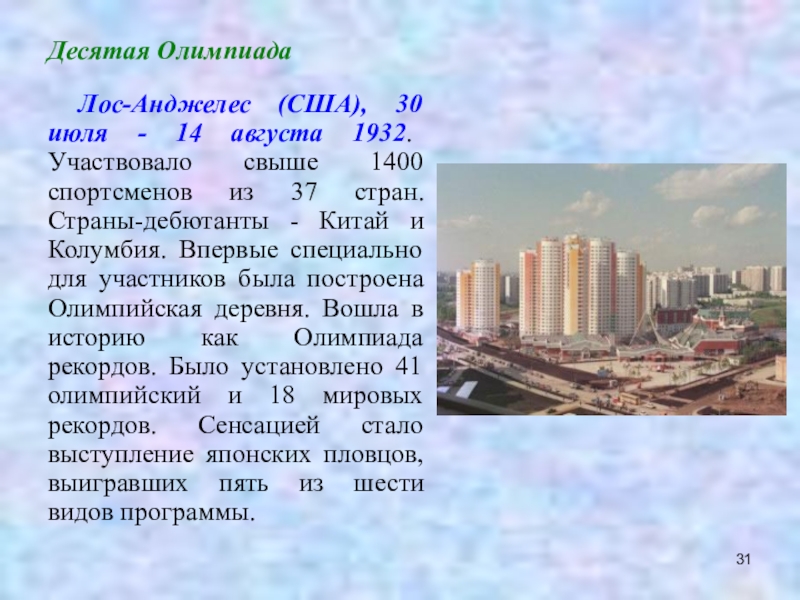 Лос-Анджелес (США), 30 июля - 14 августа 1932. Участвовало свыше