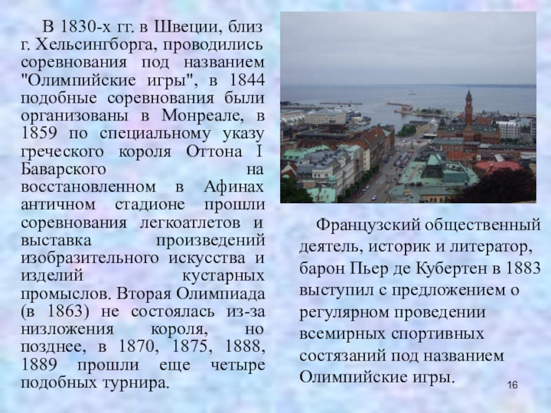 Слайд 16В 1830-х гг. в Швеции, близ г. Хельсингборга, проводились соревнования под