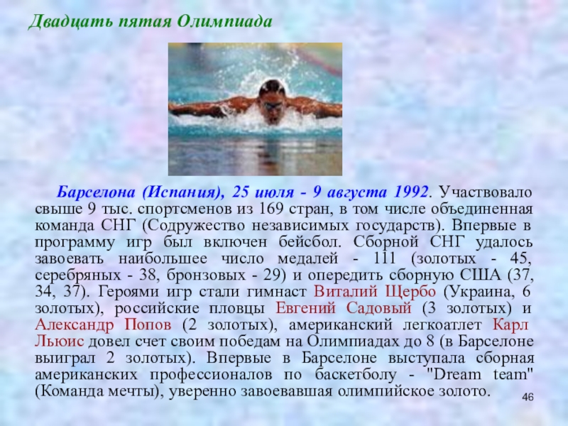 свыше 9 тыс. спортсменов из 169 стран, в том числе объединенная команда СНГ (Содружество независимых государств). Впервые в программу игр был включен бейсбол. Сборной СНГ удалось завоевать наибольшее число медалей - 111 (золотых - 45, серебряных - 38, бронзовых - 29) и опередить сборную США (37, 34, 37). Героями игр стали гимнаст Виталий Щербо (Украина, 6 золотых), российские пловцы Евгений Садовый (3 золотых) и Александр Попов (2 золотых), американский легкоатлет Карл Льюис довел счет своим победам на Олимпиадах до 8 (в Барселоне выиграл 2 золотых). Впервые в Барселоне выступала сборная американских профессионалов по баскетболу - "Dream team" (Команда мечты), уверенно завоевавшая олимпийское золото.