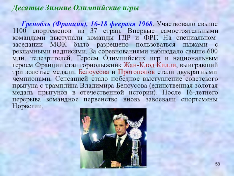 спортсменов из 37 стран. Впервые самостоятельными командами выступали команды ГДР и ФРГ. На специальном заседании МОК было разрешено пользоваться лыжами с рекламными надписями. За соревнованиями наблюдало свыше 600 млн. телезрителей. Героем Олимпийских игр и национальным героем Франции стал горнолыжник Жан-Клод Килли, выигравший три золотые медали. Белоусова и Протопопов стали двукратными чемпионами. Сенсацией стало победное выступление советского прыгуна с трамплина Владимира Белоусова (единственная золотая медаль прыгунов в отечественной истории). После 16-летнего перерыва командное первенство вновь завоевали спортсмены Норвегии.