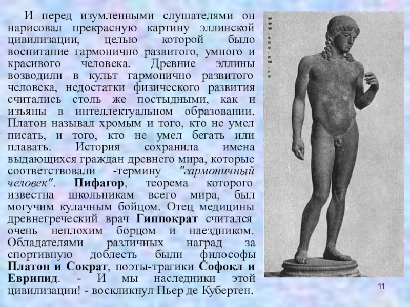 которой было воспитание гармонично развитого, умного и красивого человека. Древние эллины возводили в культ гармонично развитого человека, недостатки физического развития считались столь же постыдными, как и изъяны в интеллектуальном образовании. Платон называл хромым и того, кто не умел писать, и того, кто не умел бегать или плавать. История сохранила имена выдающихся граждан древнего мира, которые соответствовали -термину "гармоничный человек". Пифагор, теорема которого известна школьникам всего мира, был могучим кулачным бойцом. Отец медицины древнегреческий врач Гиппократ считался очень неплохим борцом и наездником. Обладателями различных наград за спортивную доблесть были философы Платон и Сократ, поэты-трагики Софокл и Еврипид. - И мы наследники этой цивилизации! - воскликнул Пьер де Кубертен.