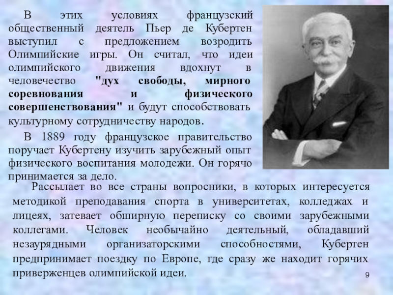 в университетах, колледжах и лицеях, затевает обширную переписку со своими зарубежными коллегами. Человек необычайно деятельный, обладавший незаурядными организаторскими способностями, Кубертен предпринимает поездку по Европе, где сразу же находит горячих приверженцев олимпийской идеи.