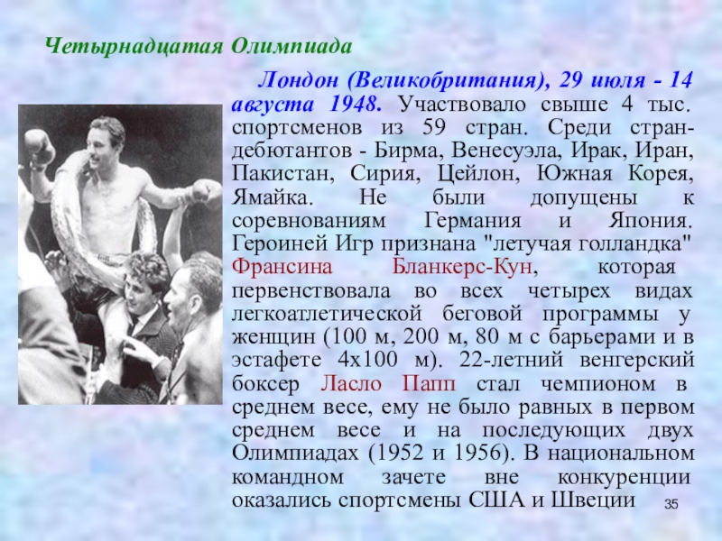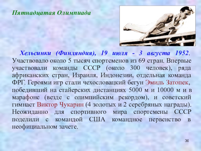 5 тысяч спортсменов из 84 стран. В числе стран-дебютантов - Марокко, Объединенная Арабская Республика (ОАР), Сан-Марино, Тунис. Римская Олимпиада стала Олимпиадой сюрпризов и рекордов (76 олимпийских, в том числе 30 мировых). Лучшими спортсменами игр признаны советский тяжеловес Юрий Власов, американская бегунья Вильма Рудольф (три золотые медали), эфиопский марафонец Абебе Бикила. Впервые на Олимпийских играх погиб спортсмен из-за применения допинга (велосипедист из Дании К. Е. Йенсен). Вновь команда СССР обошла команду США в неофициальном командном зачете.