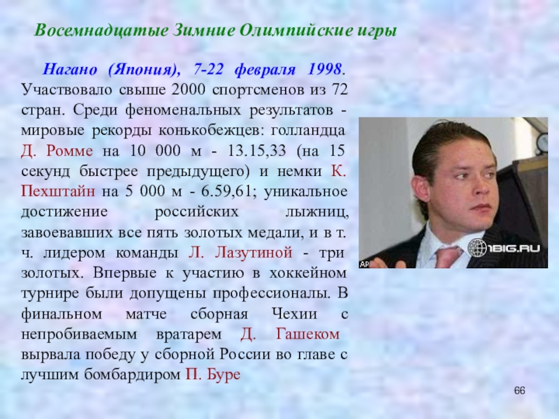 спортсменов из 72 стран. Среди феноменальных результатов - мировые рекорды конькобежцев: голландца Д. Ромме на 10 000 м - 13.15,33 (на 15 секунд быстрее предыдущего) и немки К. Пехштайн на 5 000 м - 6.59,61; уникальное достижение российских лыжниц, завоевавших все пять золотых медали, и в т. ч. лидером команды Л. Лазутиной - три золотых. Впервые к участию в хоккейном турнире были допущены профессионалы. В финальном матче сборная Чехии с непробиваемым вратарем Д. Гашеком вырвала победу у сборной России во главе с лучшим бомбардиром П. Буре