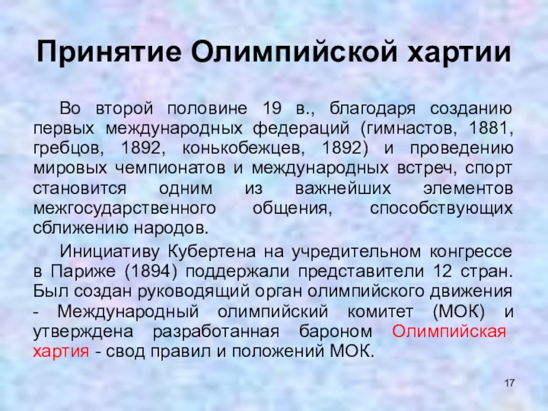 Инициативу Кубертена на учредительном конгрессе в Париже (1894) поддержали представители 12 стран. Был создан руководящий орган олимпийского движения - Международный олимпийский комитет (МОК) и утверждена разработанная бароном Олимпийская хартия - свод правил и положений МОК.