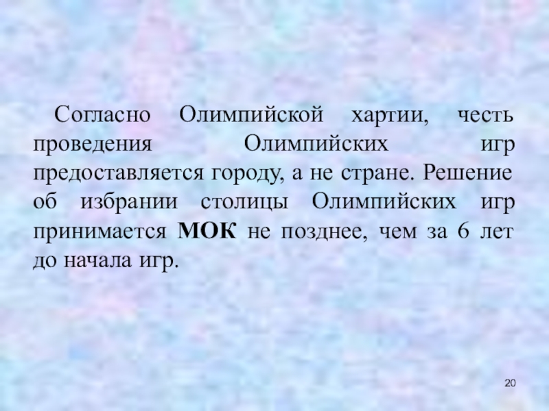 Слайд 20Согласно Олимпийской хартии, честь проведения Олимпийских игр предоставляется городу, а не