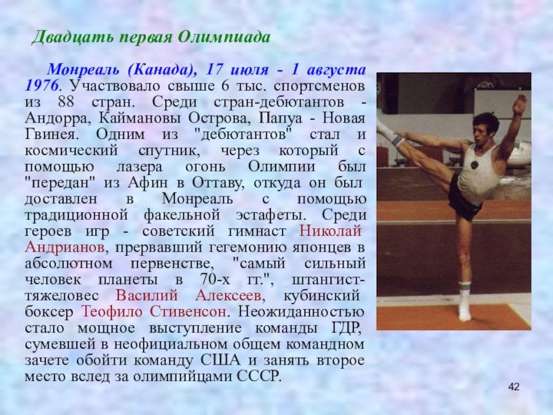 свыше 6 тыс. спортсменов из 88 стран. Среди стран-дебютантов - Андорра, Каймановы Острова, Папуа - Новая Гвинея. Одним из "дебютантов" стал и космический спутник, через который с помощью лазера огонь Олимпии был "передан" из Афин в Оттаву, откуда он был доставлен в Монреаль с помощью традиционной факельной эстафеты. Среди героев игр - советский гимнаст Николай Андрианов, прервавший гегемонию японцев в абсолютном первенстве, "самый сильный человек планеты в 70-х гг.", штангист-тяжеловес Василий Алексеев, кубинский боксер Теофило Стивенсон. Неожиданностью стало мощное выступление команды ГДР, сумевшей в неофициальном общем командном зачете обойти команду США и занять второе место вслед за олимпийцами СССР.