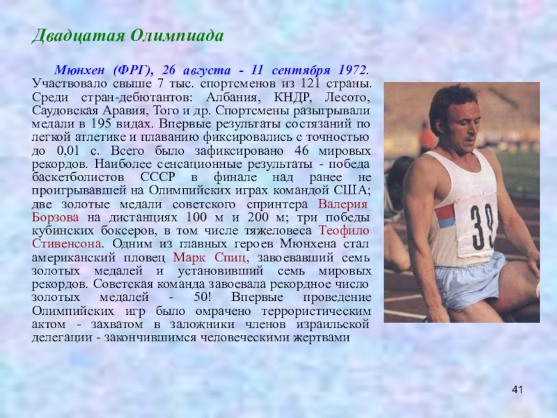7 тыс. спортсменов из 121 страны. Среди стран-дебютантов: Албания, КНДР, Лесото, Саудовская Аравия, Того и др. Спортсмены разыгрывали медали в 195 видах. Впервые результаты состязаний по легкой атлетике и плаванию фиксировались с точностью до 0,01 с. Всего было зафиксировано 46 мировых рекордов. Наиболее сенсационные результаты - победа баскетболистов СССР в финале над ранее не проигрывавшей на Олимпийских играх командой США; две золотые медали советского спринтера Валерия Борзова на дистанциях 100 м и 200 м; три победы кубинских боксеров, в том числе тяжеловеса Теофило Стивенсона. Одним из главных героев Мюнхена стал американский пловец Марк Спиц, завоевавший семь золотых медалей и установивший семь мировых рекордов. Советская команда завоевала рекордное число золотых медалей - 50! Впервые проведение Олимпийских игр было омрачено террористическим актом - захватом в заложники членов израильской делегации - закончившимся человеческими жертвами