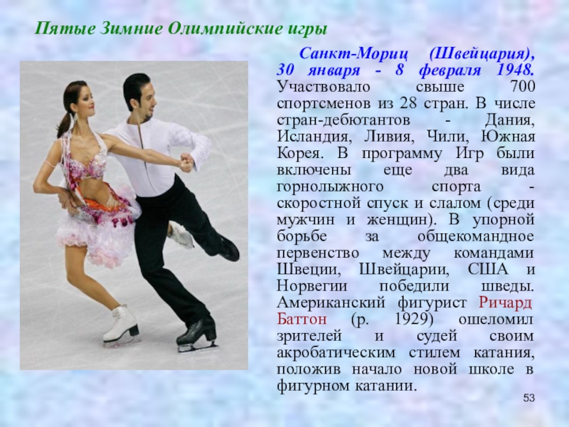 спортсменов из 17 стран. Впервые зимние Олимпийские Игры состоялись в западном полушарии. Спортсмены США и Канады составили половину всех участников. По настоянию американцев соревнования конькобежцев проводились по местным правилам - общий старт для всех участников. И все 4 золотые медали выиграли конькобежцы из сборной США. Они также первенствовали в соревнованиях бобслеистов. Европейцы завоевали 4 медали в лыжном спорте и три в фигурном катании, где вновь вне конкуренции была Соня Хени