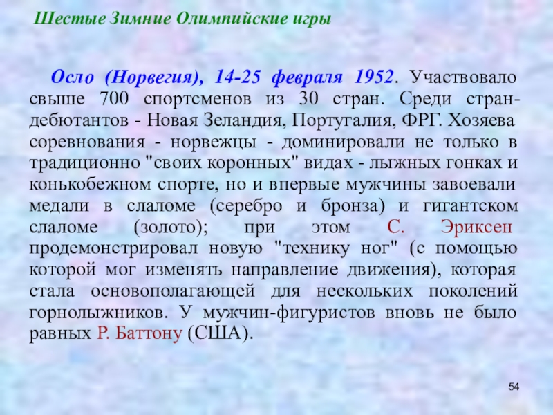 Осло (Норвегия), 14-25 февраля 1952. Участвовало свыше 700