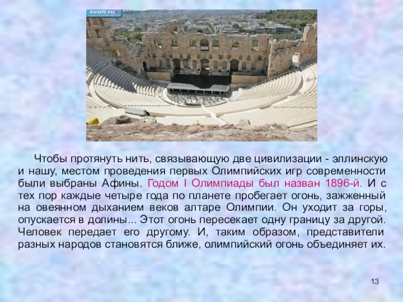 проведения первых Олимпийских игр современности были выбраны Афины. Годом I Олимпиады был назван 1896-й. И с тех пор каждые четыре года по планете пробегает огонь, зажженный на овеянном дыханием веков алтаре Олимпии. Он уходит за горы, опускается в долины... Этот огонь пересекает одну границу за другой. Человек передает его другому. И, таким образом, представители разных народов становятся ближе, олимпийский огонь объединяет их.