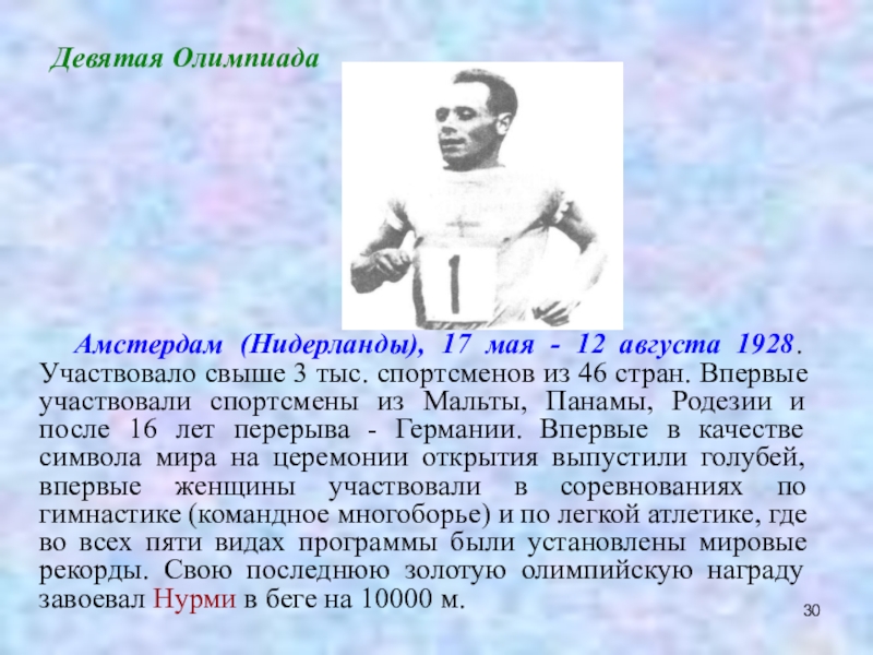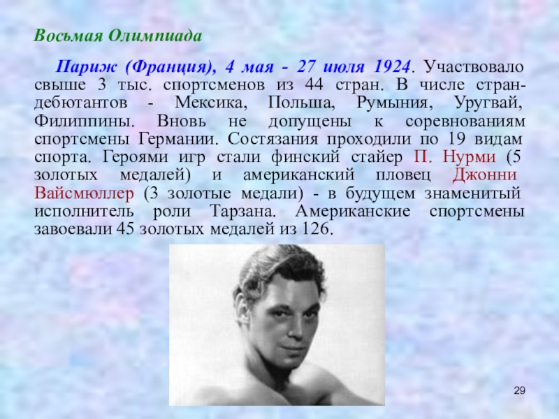 3 тыс. спортсменов из 44 стран. В числе стран-дебютантов - Мексика, Польша, Румыния, Уругвай, Филиппины. Вновь не допущены к соревнованиям спортсмены Германии. Состязания проходили по 19 видам спорта. Героями игр стали финский стайер П. Нурми (5 золотых медалей) и американский пловец Джонни Вайсмюллер (3 золотые медали) - в будущем знаменитый исполнитель роли Тарзана. Американские спортсмены завоевали 45 золотых медалей из 126.