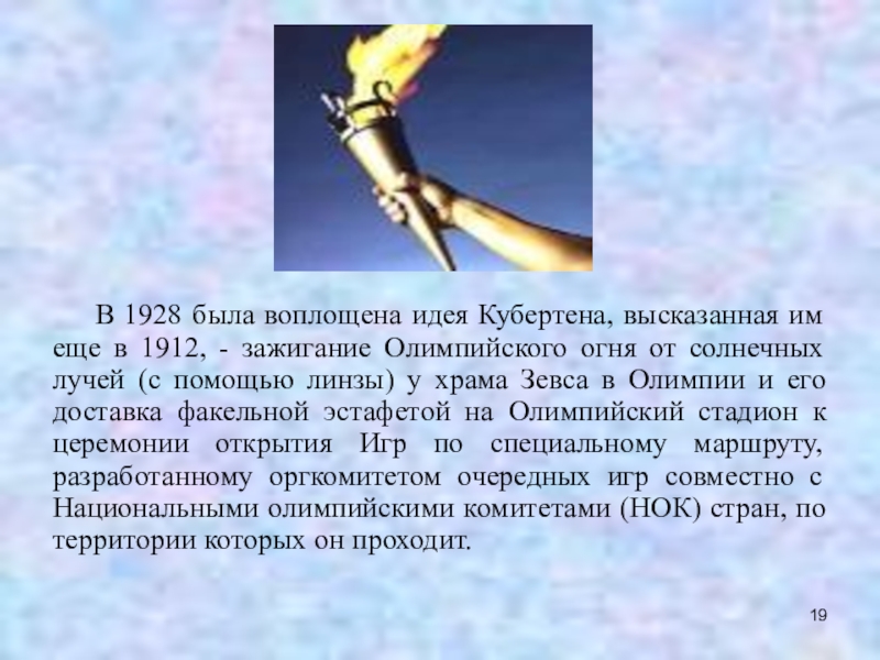 Слайд 19В 1928 была воплощена идея Кубертена, высказанная им еще в 1912,