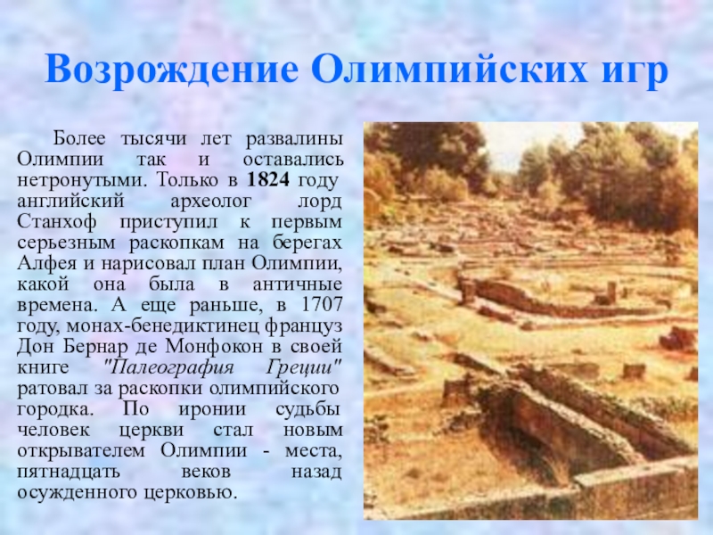 Только в 1824 году английский археолог лорд Станхоф приступил к первым серьезным раскопкам на берегах Алфея и нарисовал план Олимпии, какой она была в античные времена. А еще раньше, в 1707 году, монах-бенедиктинец француз Дон Бернар де Монфокон в своей книге "Палеография Греции" ратовал за раскопки олимпийского городка. По иронии судьбы человек церкви стал новым открывателем Олимпии - места, пятнадцать веков назад осужденного церковью.