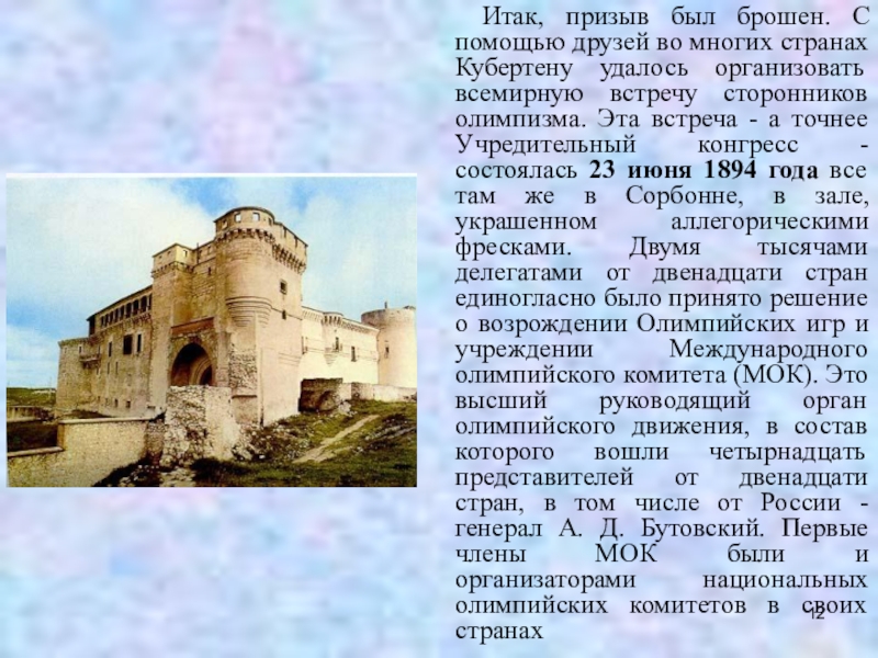 Слайд 12Итак, призыв был брошен. С помощью друзей во многих странах Кубертену