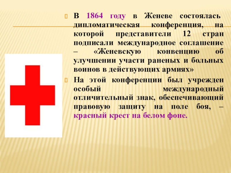На этой конференции был учрежден особый международный отличительный знак, обеспечивающий правовую защиту на поле боя, – красный крест на белом фоне.