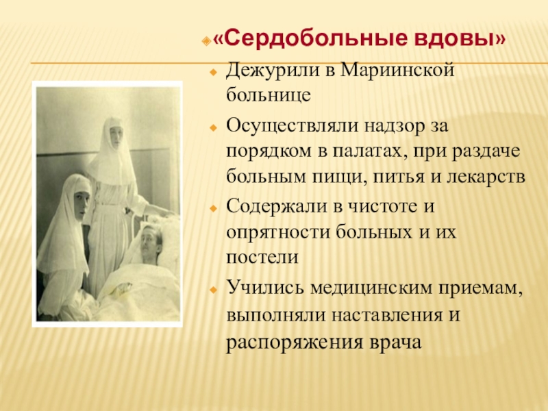 дома’’ на добровольных началах были приглашены и направлены в больницу женщины для ‘’прямого назначения’’ ходить и смотреть за больными. Вдовы, осуществляющие надзор в больницах, наблюдали за порядком раздачи и приема пищи и лекарственных препаратов, за чистотой и опрятностью больных, их постели и белья.