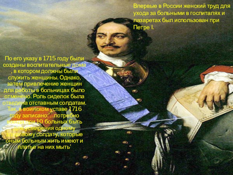 По его указу в 1715 году были созданы воспитательные дома , в котором должны были служить женщины. Однако, затем привлечение женщин для работы в больницах было отменено. Роль сиделок была отведена отставным солдатам. Так, в воинском уставе 1716 году записано:’…потребно всегда при 10 больных быть для усмирения одному здоровому солдату, которые оным больным жить имеют и платье на них мыть’