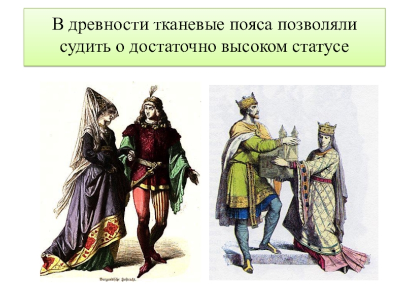 Слайд 9 В древности тканевые пояса позволяли судить о достаточно высоком статусе