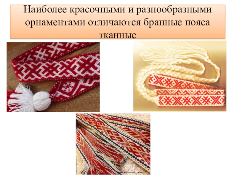 Слайд 11 Наиболее красочными и разнообразными орнаментами отличаются бранные пояса тканные