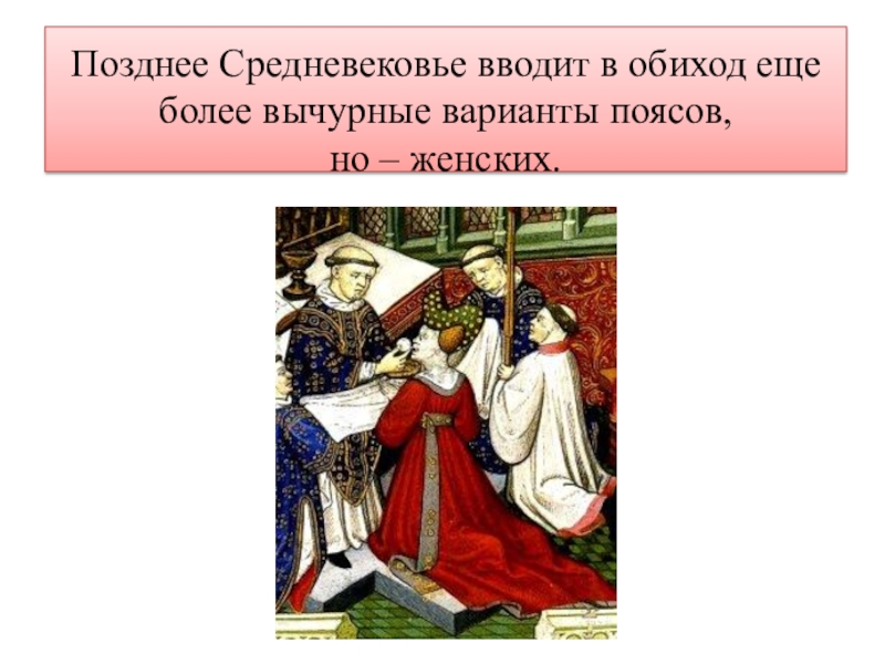 Слайд 7 Позднее Средневековье вводит в обиход еще более вычурные варианты поясов, но