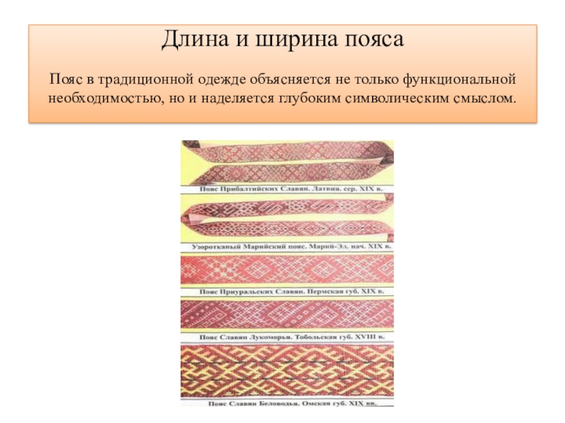 Слайд 12Длина и ширина пояса Пояс в традиционной одежде объясняется не только функциональной