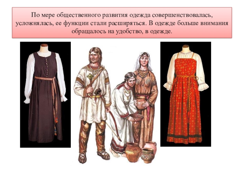 Слайд 3По мере общественного развития одежда совершенствовалась, усложнялась, ее функции стали расширяться.