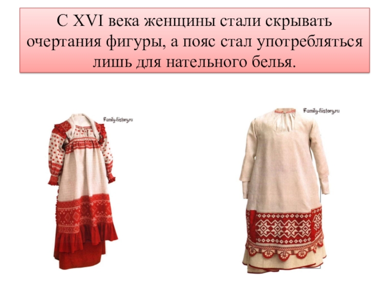 Слайд 13 С XVI века женщины стали скрывать очертания фигуры, а пояс стал