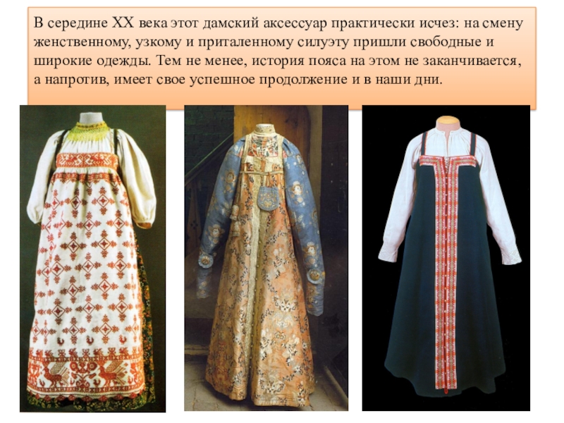женственному, узкому и приталенному силуэту пришли свободные и широкие одежды. Тем не менее, история пояса на этом не заканчивается, а напротив, имеет свое успешное продолжение и в наши дни.