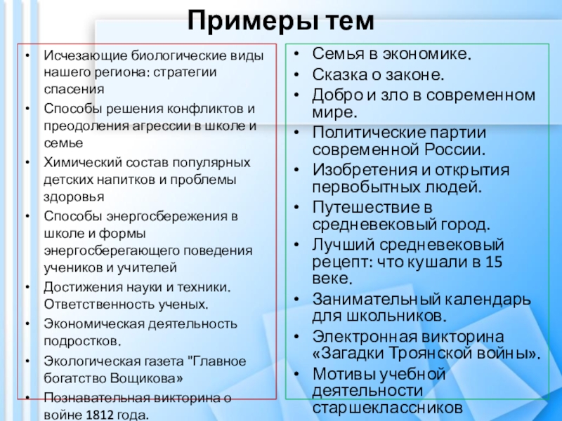 1. Учащиеся самостоятельно выбирают тему проекта.