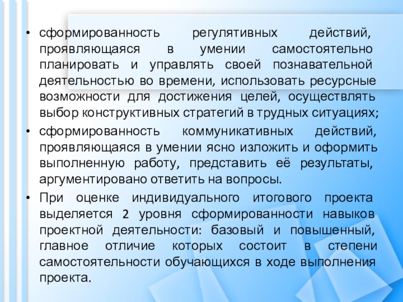 При оценке индивидуального итогового проекта выделяется 2 уровня сформированности навыков проектной деятельности: базовый и повышенный, главное отличие которых состоит в степени самостоятельности обучающихся в ходе выполнения проекта.