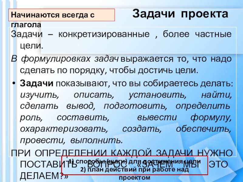 Задачи показывают, что вы собираетесь делать: изучить, описать, установить, найти, сделать вывод, подготовить, определить роль, составить, вывести формулу, охарактеризовать, создать, обеспечить, провести, выполнить.