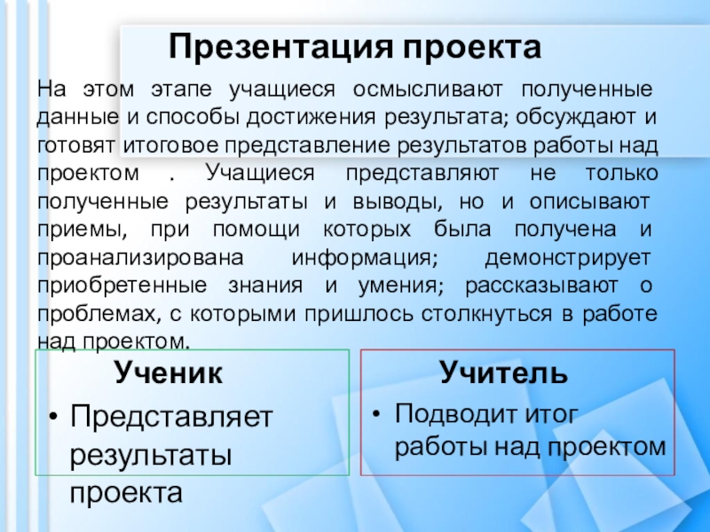 осмысливают полученные данные и способы достижения результата; обсуждают и готовят итоговое представление результатов работы над проектом . Учащиеся представляют не только полученные результаты и выводы, но и описывают приемы, при помощи которых была получена и проанализирована информация; демонстрирует приобретенные знания и умения; рассказывают о проблемах, с которыми пришлось столкнуться в работе над проектом.